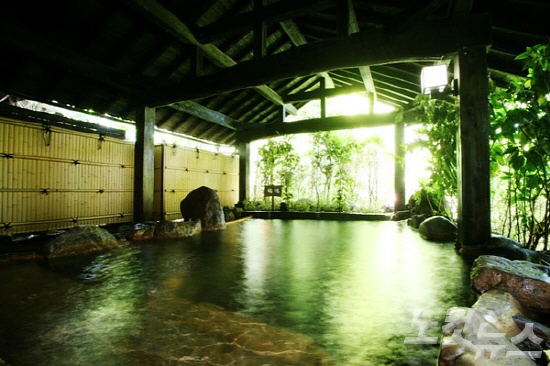 현관을 들어서면 개방감 넘치는 넓은 로비를 마주하게 된다. 머리 위로 펼쳐지는 높은 천장은 일본만의 독특한 건축미가 느껴지며 창문으로는 졸졸 흐르는 계곡물 소리와 물레방아 소리가 마음을 한층 더 편안하게 어루만져 주는 느낌의 일본 정원을 감상할 수 있다.