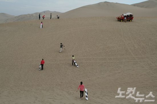 모래언덕을 따라 오르내리다 마지막에 도착하는 가장 높은 모래언덕은 버기투어의 백미다. 샌드보드를 타게된다. 보드에 엎드려 누워 살짝 앞으로 중심을 두고 내려가다 보면 엄청난 속도에 저절로 환호성이 나온다. 눈 깜짝할 사이에 모래언덕을 언덕 아래에 도착한다.