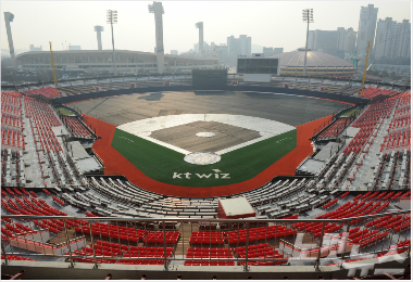 수원시를 연고로 하는 신생 프로야구 10구단인 kt위즈가 전용 경기장으로 사용할 ‘수원 야구장’이 그 위용을 드러냈다.