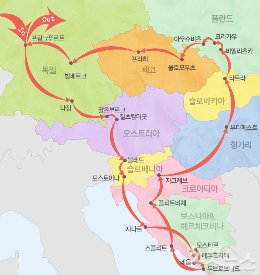 동유럽 발칸 여행맵, 프랑크푸르트 in out (사진=KRT여행사 제공)