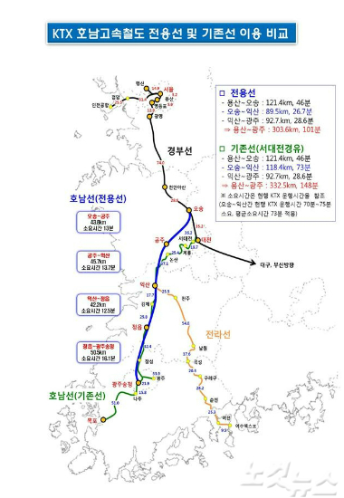오는 3월 호남고속철도 1단계 구간이 개통되면 오송에서 광주까지 55분이 소요될 것으로 전망되지만, 기존선을 이용해 서대전역을 경유하게 되면 소요시간이 2배 가까이 늘어나게 된다.