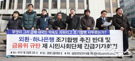 금융정의연대 등 시민사회단체 회원들이 22일 오후 서울 태평로 금융위원회 앞에서 ‘외환-하나은행 조기합병 반대 및 금융위 규탄 기자회견’을 갖고 있다.