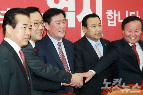 연말정산 환급액 축소 논란과 관련해 지난 21일 오후 국회 새누리당 원내대표실에서 열린 긴급 당정협의에서 최경환 경제부총리(가운대)와 새누리당 지도부가 손을 잡고 있다. (좌측부터 새누리당 나성린 수석정책위부의장, 주호영 정책위의장, 최경환 부총리, 이완구 원내대표, 김재원 원내수석부대표) (사진=윤창원 기자)