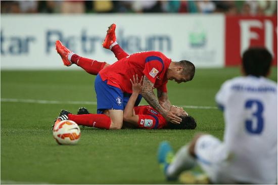 골을 터뜨린 손흥민과 함께 기쁨을 나누고 있는 차두리 (사진=대한축구협회 제공)
