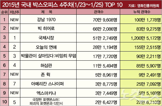 한달 넘게 1위를 유지했던 '국제시장'은 51만 2,749명으로 3위를 차지했다. 누적 관객수 1,200만 5,172명으로 역대 흥행 순위 6위, 1위는 1,761만 3,702명을 기록한 '명량'이다.