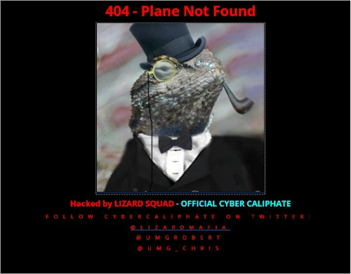 해커는 웹사이트 초기 화면에 ‘404-비행기 실종(Plane Not Found)’이라는 메시지를 띄우고, 그 아래 대문 사진을 턱시도 차림에 중절모를 쓴 도마뱀으로 바꾸었다.