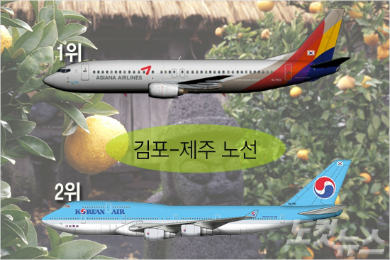 김포~제주 노선은 세계에서 탑승객이 가장 많은 알짜 노선이다. 지난해 이 노선의 전체 승객은 1천388만4천명으로 수송 분담률은 아시아나항공이 22.9%, 대한항공이 19.4%였다.
