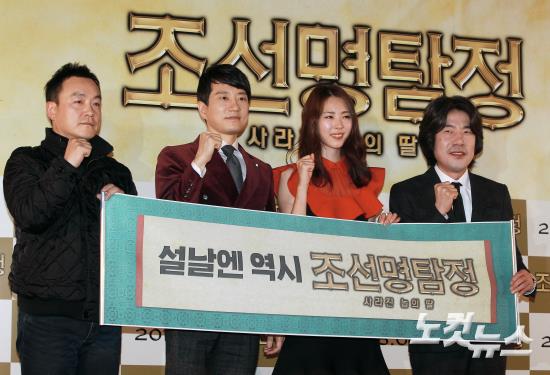 김석윤 감독(왼쪽부터), 배우 김명민, 이연희, 오달수가 2일 오후 서울 동대문 메가박스에서 열린 영화 ‘조선명탐정 : 사라진 놉의 딸’ 언론시사회에서 포토타임을 갖고 있다.