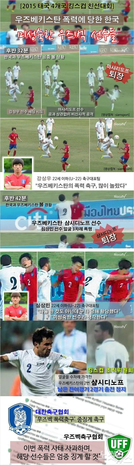 영상을 자세히 보니 더 화가 나네요. 어떻게 이런 축구를 하고 있는지, 우즈벡 선수들의 상식 이하 폭력으로 우즈벡은 한동안 쌈박질 축구 ‘오명’을 안아야 할 것 같습니다.