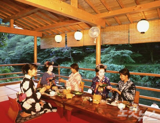 6월초부터 9월 중순까지는 석식을 가와도코에서 먹을 수 있는데 특별히 마이코상(게이샤)가 동석한다. 또한 가와도코에서의 식사를 마치고 식사처의 불이 꺼진 후에는 객실에서 반딧불을 감상할 수도 있다.