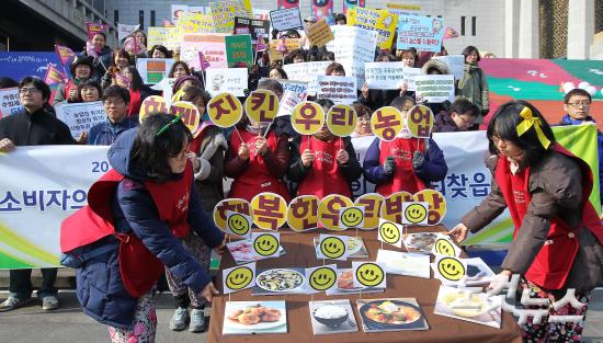 5일 오전 서울 세종문화회관 앞에서 2015 우리농업지키기 소비자 10만인대회 추진 선언 기자회견에서 참석자들이 수입 농산물로 채워진 식탁을 엎은 뒤 우리 농산물로 채워진 식탁을 선보이는 퍼포먼스를 하고 있다.