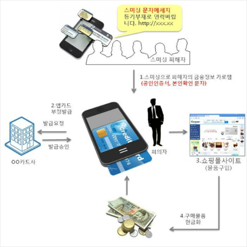 악성코드로 피해자의 스마트폰에 저장된 공인인증서, 인증용 문자메시지 등 금융정보를 전송받으면, 앱카드를 새로 발급받아 인터넷 쇼핑몰에서 모바일 상품권을 결제하는 수법을 사용했다.