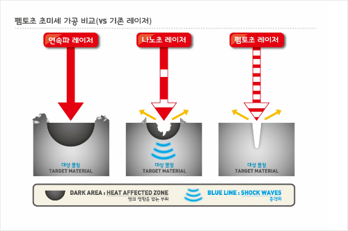 이 극초단 레이저 광원 기술을 최근 각 부품이나 제품의 소형화, 정밀화가 진행되면서 각광받고 있는 초미세 가공 분야에 적용하면 충격파에 의한 왜곡이나 표면의 파편 잔해, 열에 의한 주변 재료 변질, 미세 크랙 발생 등의 부작용 없이 섬세하게 가공할 수 있다.