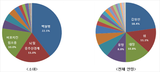 이 가운데 백혈병이 3484명으로 전체의 22.1%를 차지했다. 이어 '뇌 및 중추신경계' 질환이 11.0%, 혈액암의 일종인 '비호지킨 림프종'이 10.0% 순이었다.