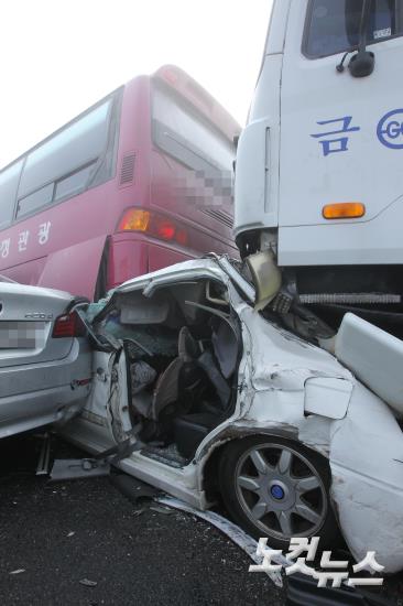 11일 오전 9시 40분쯤 짙은 안개로 60중 추돌사고가 발생한 인천 영종대교에 파손된 사고 차량들이 널브러져 있다.