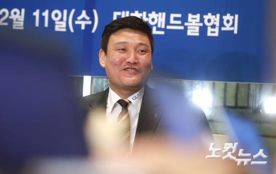 윤경신 핸드볼남자국가대표팀 신임 감독이 11일 오전 서울 신문로의 한 중식당에서 열린 자신의 감독 취임 기념 기자간담회에서 밝은 표정으로 취재진의 질문에 답하고 있다.