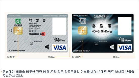 전남대학교는 기존의 학생증을 신용카드와 직불카드 기능을 포함하는 스마트 카드 학생증으로 교체하기로 하고, 2008년 봄 학기부터 학생들의 개별 신청을 받아 스마트 카드를 발급하고 있다.[BestNocut_R]