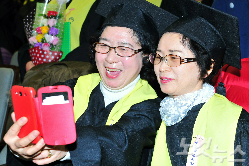 13일 오전 경기과학고 과학영재연구센터 컨퍼런스홀에서 열린 합동졸업식에서 휴대전화를 이용해 기념촬영을 하는 만학도들