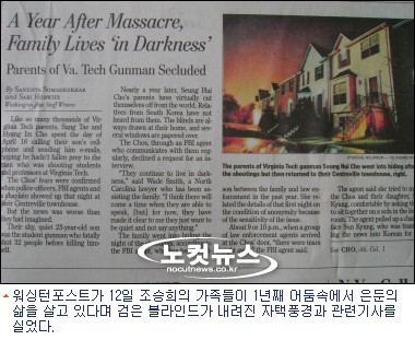 워싱턴포스트는 12일(현지시간) ''조승희의 부모는 어둠속에서 1년째 세상과 떨어져 은둔의 삶을 살고 있다''고 보도했다.[BestNocut_L]