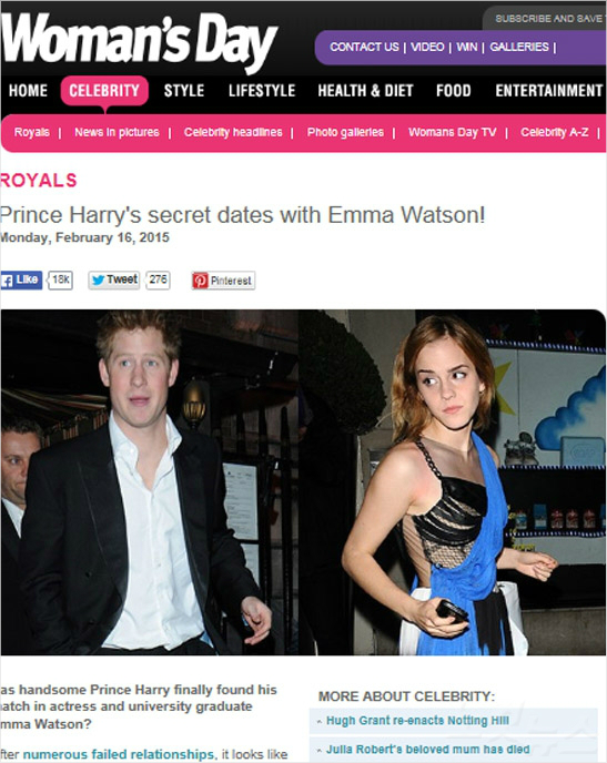 20일(현지 시각) 우먼스 데이(Woman's Day)는 엠마 왓슨과 해리 윈즈 왕자가 최근 비밀 데이트를 즐겼다고 보도했다.