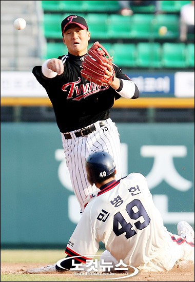 [BestNocut_R]13일 오후 서울 잠실야구장에서 열린 프로야구 두산-LG의 경기 9회말 무사 1루 상황에서 LG 2루수 이종열이 채상병의 내야땅볼을 병살 처리하고 있다.