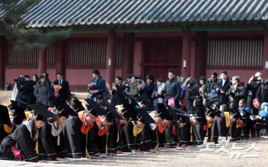 25일 오전 서울 종로구 성균관대학교 2014학년도 전기 학위수여식에 앞서 졸업생들이 성균관 대성전에서 조선 전통 졸업식을 재현한 고유례(告由禮)를 올리고 있다. 고유례는 성균관대에서 입학·졸업 등 큰 행사가 있을 때 공자사당을 찾아 고하는 고유의식이다.