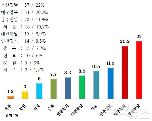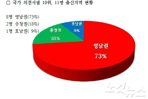 또 중요 정책을 심의하는 헌법상 기관인 국무회의의 국무위원으로 임명된 전현직 인사 33명 가운데 영남권 출신은 11명에 이르렀다. 반면 충청권과 호남권은 각각 5명, 4명에 불과했다.