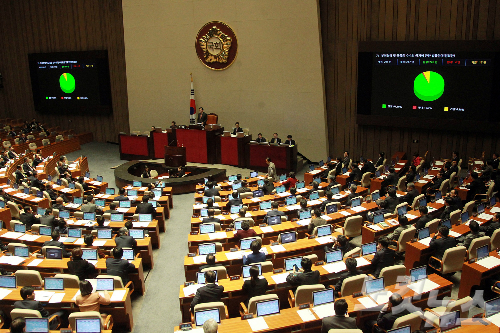 3일 오후 국회 법사위를 통과한 김영란법(부정청탁 및 금품등 수수의 금지에 관한 법률안)이 본회의에서 재석 247인, 찬성 226인, 반대 4인, 기권 17인으로 가결되고 있다. (사진=윤창원 기자)