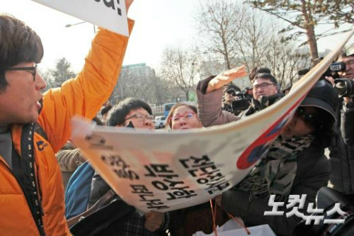 지난 1월 20일 서울 용산구 전쟁기념관 앞에서 열린 '자유북한운동연합'의 대북전단 살포에 대한 기자회견에서 탈북단체 관계자들이 기자회견 장소 옆에서 피켓시위를 벌이던 '전쟁반대 평화실현 국민행동' 회원의 전단살포 반대 피켓을 빼앗으려 하고 있다. (자료사진)
