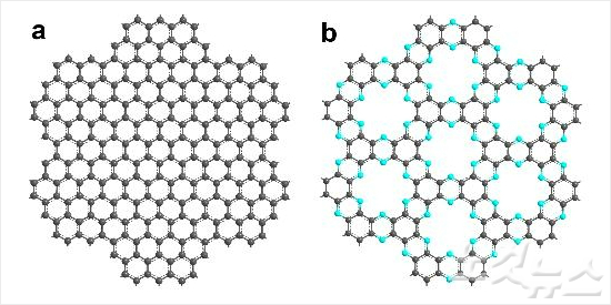 전부 탄소(회색 구)로 이루어져 있는 그래핀(a)과 달리 국내 연구진이 개발한 새로운 2차원 구조체(b)는 규칙적으로 구멍이 뚫려 있고 6개의 질소원소(하늘색 구)가 각 구멍의 중심을 향해 있는 구조다.