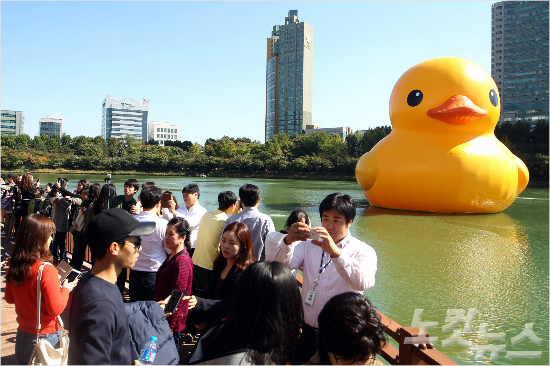 전 세계적으로 많은 사람들의 사랑과 관심을 끌고있는 1톤의 초대형 고무오리 '러버덕'이 지난해 10월 14일 서울 송파구 석촌호수에 전시됐다. '러버덕'은 네덜란드 출신의 예술가 플로렌타인 호프만의 공공미술 프로젝트이다. (윤성호 기자)