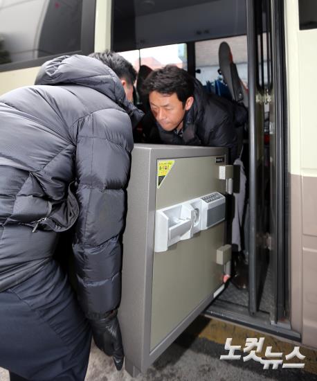 방위사업비리 정부합동수사단이 무기중개업체 일광공영 본사 등지를 압수수색한 11일 오후 합수단 관계자들이 서울 성북구 돈암동 무기중개업체 일광공영 본사에서 압수한 금고를 옮기고 있다.