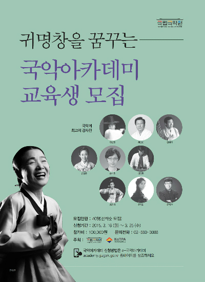 국립국악원은 (재)전통공연예술진흥재단과 공동으로 인문학과 국악, 교육과 공연을 연계한 국악아카데미를 4월부터 6월까지 운영하고, 오는 3월 16일(월)부터 25일(수)까지 수강자를 선착순 모집한다.