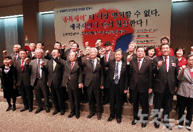 애국단체총협의회, 호국안보단체협의회, 선진화시민행동 등 500여개 보수단체가 18일 오후 중구 태평로 프레스센터에서 '종북세력청산범국민협의회' 출범식을 가지며 구호를 외치고 있다. 윤창원기자