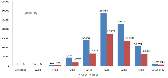 연령별로는 남성의 경우 50대가 2만 8814명, 50대가 2만 2923명으로 많았고 40대는 1만 4088명이었다. 여성은 50대가 1만 7279명, 60대가 1만 3588명, 40대는 6712명 순으로 나타났다.