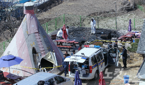 인천 강화경찰서 관계자들이 23일 오전 인천시 강화군 동막해수욕장 인근 모 캠핑장에 대한 압수수색을 실시했다. 이 캠핑장에서는 지난 22일 화재가 발생, 어린이 4명 등 7명의 사상자가 발생했다. (사진=박종민 기자)