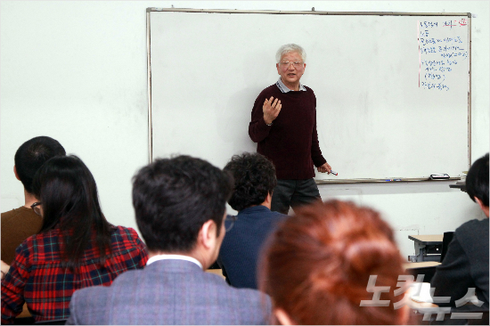24일 오후 서울 구로구 성공회대에서 마르크스주의 경제학자 김수행 성공회대 석좌교수가 학생들에게 강의하고 있다. 윤성호기자