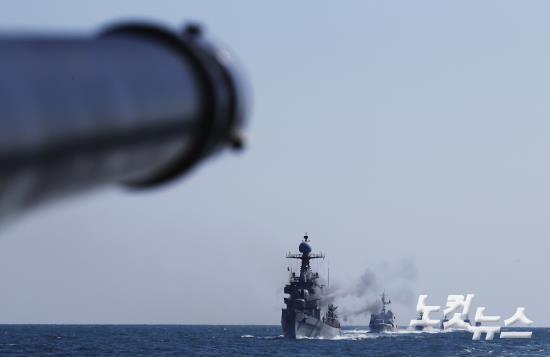 24일 오후 경기도 태안 서쪽 50마일 덕적도 인근 해역에서 실시된 천안함 5주기 서해 해상기동훈련에서 을지문덕함, 인천함, 청주함(왼쪽부터) 등 참가한 함정들이 대함 사격훈련을 실시하고 있다.