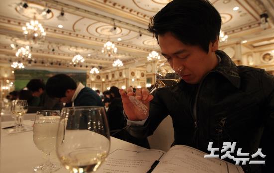 26일 오전 서울 논현동 임피리얼팰리스호텔에서 열린 ‘제14회 한국 소믈리에 대회 1차 예선’ 참가자들이 블라인드 테이스팅을 하고 있다.