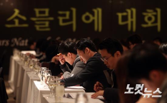26일 오전 서울 논현동 임피리얼팰리스호텔에서 열린 ‘제14회 한국 소믈리에 대회 1차 예선’ 참가자들이 블라인드 테이스팅을 하고 있다.