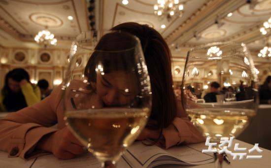 26일 오전 서울 논현동 임피리얼팰리스호텔에서 열린 ‘제14회 한국 소믈리에 대회 1차 예선’ 참가자들이 블라인드 테이스팅을 하고 있다.