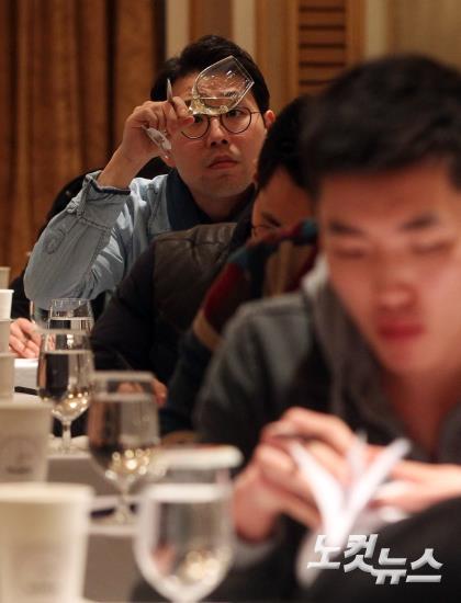 26일 오전 서울 논현동 임피리얼팰리스호텔에서 열린 ‘제14회 한국 소믈리에 대회 1차 예선’ 참가자들이 블라인드 테이스팅을 하고 있다.