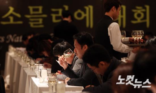 26일 오전 서울 논현동 임피리얼팰리스호텔에서 열린 ‘제14회 한국 소믈리에 대회 1차 예선’ 참가자들이 블라인드 테이스팅을 하고 있다.