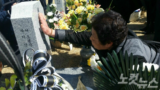 천안함 피격 5주기인 26일 국립 대전현충원 '천안함 46 용사' 묘역에서 이창기 준위의 어머니가 묘비를 어루만지고 있다. (사진=대전CBS 고형석 기자)