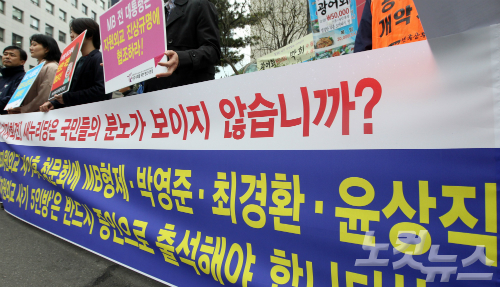 MB자원외교 진상규명 국민모임 소속 시민사회단체 회원들이 31일 오전 서울 여의도 새누리당사 앞에서 기자회견을 갖고 MB정부에서 추진된 해외자원개발 사업 실패의 책임자인 이 전 대통령을 포함한 5인방(이상득 전 의원, 박영준 전 차관, 최경환 경제부총리, 윤상직 산자부 장관)의 자원외교 의혹 청문회 출석을 촉구하고 있다. (사진=황진환 기자)