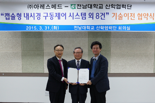 전남대 로봇연구소장 박종오 교수(왼쪽)와 우영메디칼 이영규 회장, 송진규 전남대 산학협력단장이 31일 '능동 캡슐 내시경' 기술이전 협약식을 한 뒤 기념촬영을 하고 있다(전남대 제공)