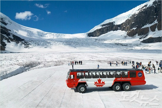 스노우코치에서는 특수 제작된 설상차를 타고 약 2만년 전에 생성된 길이 6km, 두께 300m의 아사바스카 빙하를 직접 체험할 수 있다.