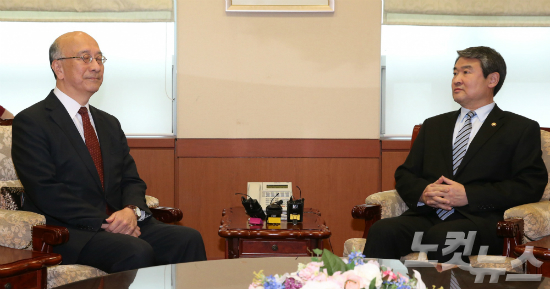 일본 정부가 '독도는 한국이 불법 점거중'이라는 왜곡된 사실을 담은 중학교 교과서 검정을 승인한 2015년 4월 6일 오후 한국 외교부로부터 초치된 벳쇼 주한 일본대사가 서울 외교부청사에서 조태용 제1차관을 만나 악수 없이 자리에 앉고 있다. (사진=윤성호 기자)