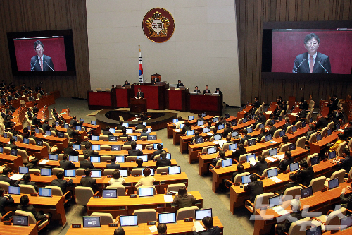 새누리당 유승민 원내대표가 8일 오전 국회 본회의에서 교섭단체대표연설을 하고 있다. (사진=윤창원 기자)