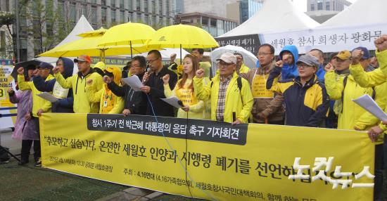 14일 오후 서울 광화문광장에서 4.16연대 주최로 세월호 참사 1주기 전 박근혜 대통령의 응답 촉구 기자회견이 열리고 있다.